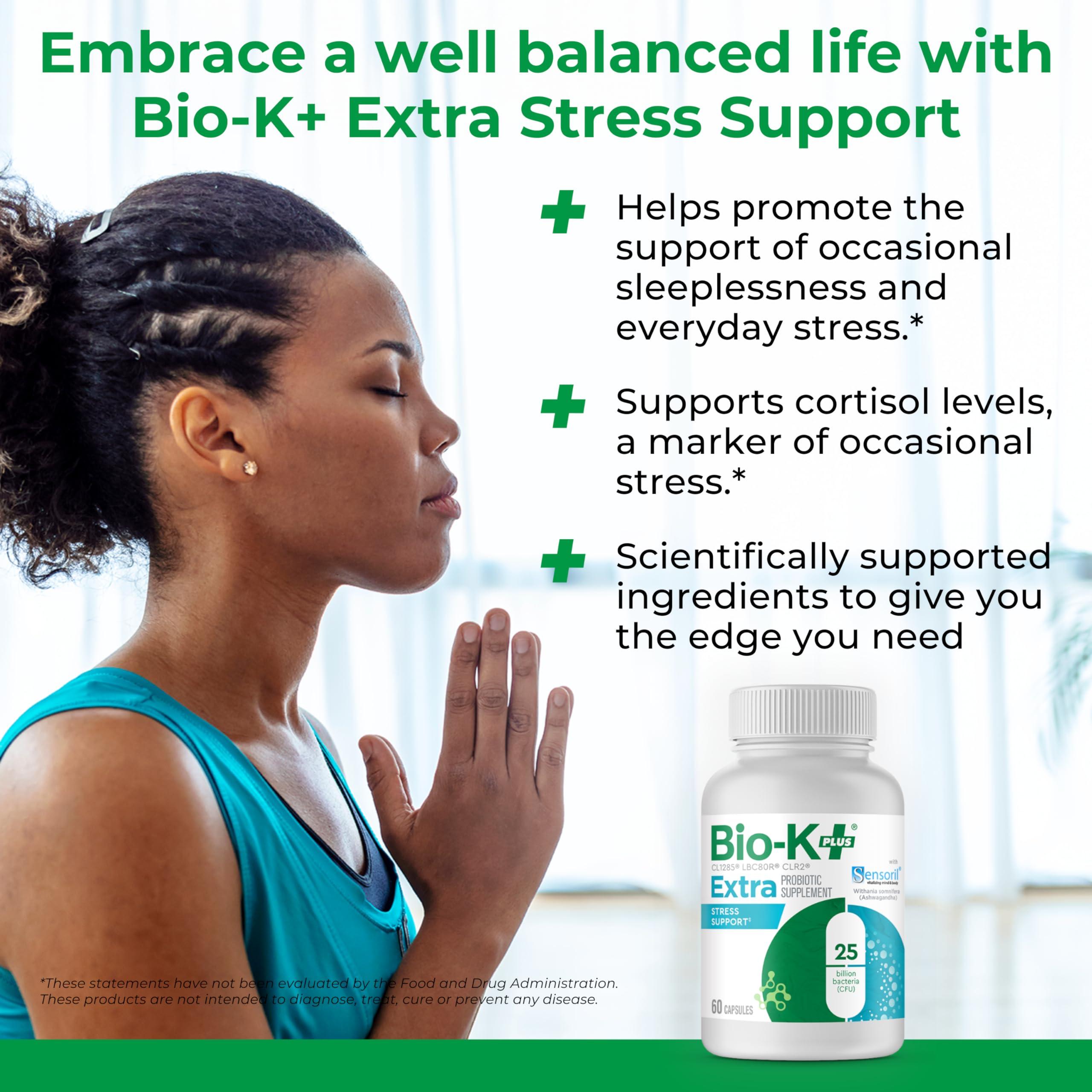 - POWERFUL STRESS SUPPORT Bio K+ Extra Stress is a potent probiotic supplement designed to support everyday stress. It also helps promote the support of occasional sleeplessness