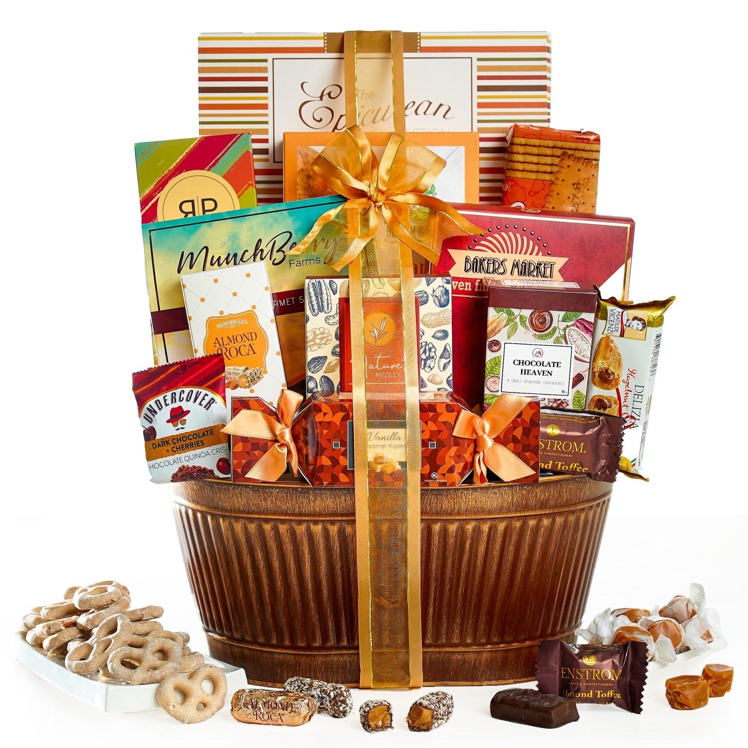 - GOURMET GIFT BASKETS: Send joy anywhere with individually wrapped sweets and snacks handcrafted for your recipient. Beautifully packaged, this gift basket is perfect for congratulations, appreciation, thank you, birthday, retirement, or engagement.