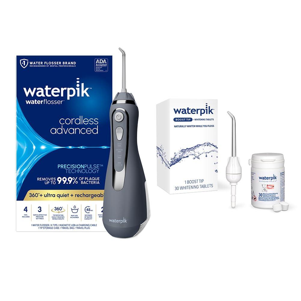 The Waterpik Cordless Advanced 2.0 water flosser and Boost flossing tip with 30 fresh mint whitening tablets bundle offers the convenience of cordless water flossing and precision teeth whitening. Rechargeable, portable, and with an extra quiet design, the Cordless Advanced 2.0 water flosser includes 3 pressure settings to personalize your water pressure intensity and 4 flossing tips for various dental needs. It also features a waterproof design for use in the shower, 360-degree tip rotation, 4-hour rapid charge, and an easy to fill reservoir. The Waterpik Cordless Advanced 2.0 water flosser removes up to 99.9% of plaque bacteria that causes gingivitis, cavities, and bad breath from treated areas and is clinically proven up to 2X as effective as string floss for removing bacterial plaque and improving gum health. Waterpik is the #1 water flosser brand recommended by dental professionals, and the Waterpik Cordless Advanced 2.0 water flosser is accepted by the American Dental Association (ADA) for safety and effectiveness. Backed by a 2-year manufacturer's limited warranty, see product manual for details. The genuine Waterpik brand Boost Tip + Whitening Tablets deliver precision teeth whitening while you water floss. Use the Boost Tip with a whitening tablet daily to remove stains from hard-to-reach areas, between teeth, and at the gumline that other products miss. Removes an additional 25% more stains than brushing alone and its easy to use. Click the Boost Tip into the water flosser handle, twist open, place a whitening tablet, and floss as usual with lukewarm water. Whitening infuser technology mixes water with a gentle stain removal agent and provides a minty fresh flossing experience. Tablets have a refreshing mint taste and leave your mouth feeling incredibly clean and fresh. With the power of an advanced Waterpik water flosser and Waterpik whitening infuser technology, this bundle has everything you need for whiter and healthier smile.