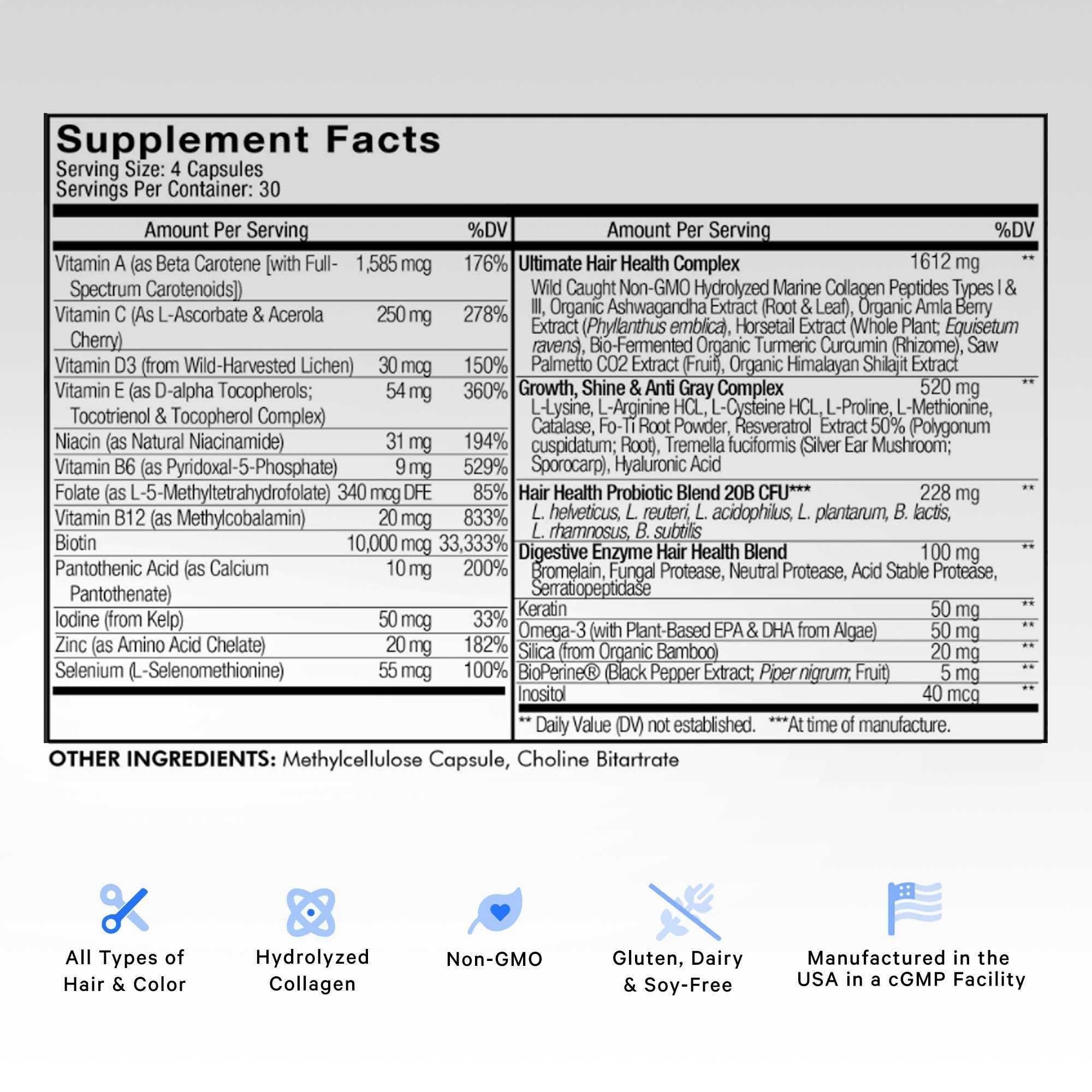 - Manufactured in the USA: Codeage Hair capsules vitamins formula is non-GMO, gluten, soy, and dairy-free. It is also free of shellfish. This beauty supplement is manufactured in the USA with global ingredients in a cGMP-certified facility for quality and purity. Each bottle provides a one-month supply.