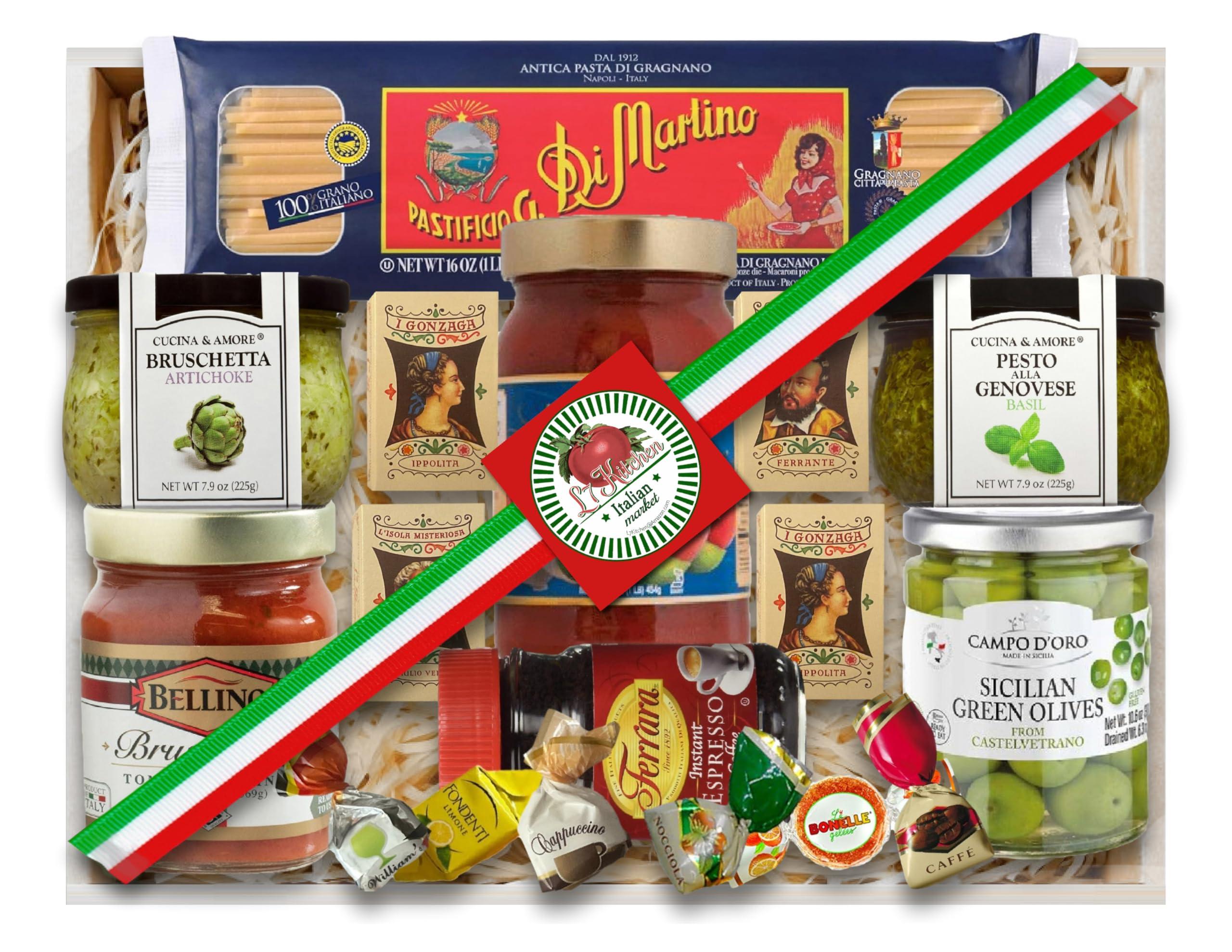 Indulge in the rich flavors of Italy with this deluxe Italian gift basket. Enjoy a delicious, full size selection of imported IIalian gourmet foods from appetizers to dessert. Filled with 12 authentic Italian specialties including bruschetta, Castelvetrano olives, imported 100% Durum Wheat Semolina Pasta , tomato sauce, basil pesto, espresso and assorted treats.