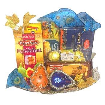Present their sweet gifts this Diwali on a Silver Platter! Your friends and loved ones will love enjoy Soan Papdi, Ferrero Rocher Trio, Fruit Turkish Delights, Coconut Cookies, and more. Celebrate the Festival with them, no matter where you are, when you send Diwali Sweetness. Please note: this item is shipped from our Boston warehouse. Shipping to Western, Southwestern, & Northwestern states may take up to 5 business days. This basket is not available for delivery to Alaska and Hawaii.