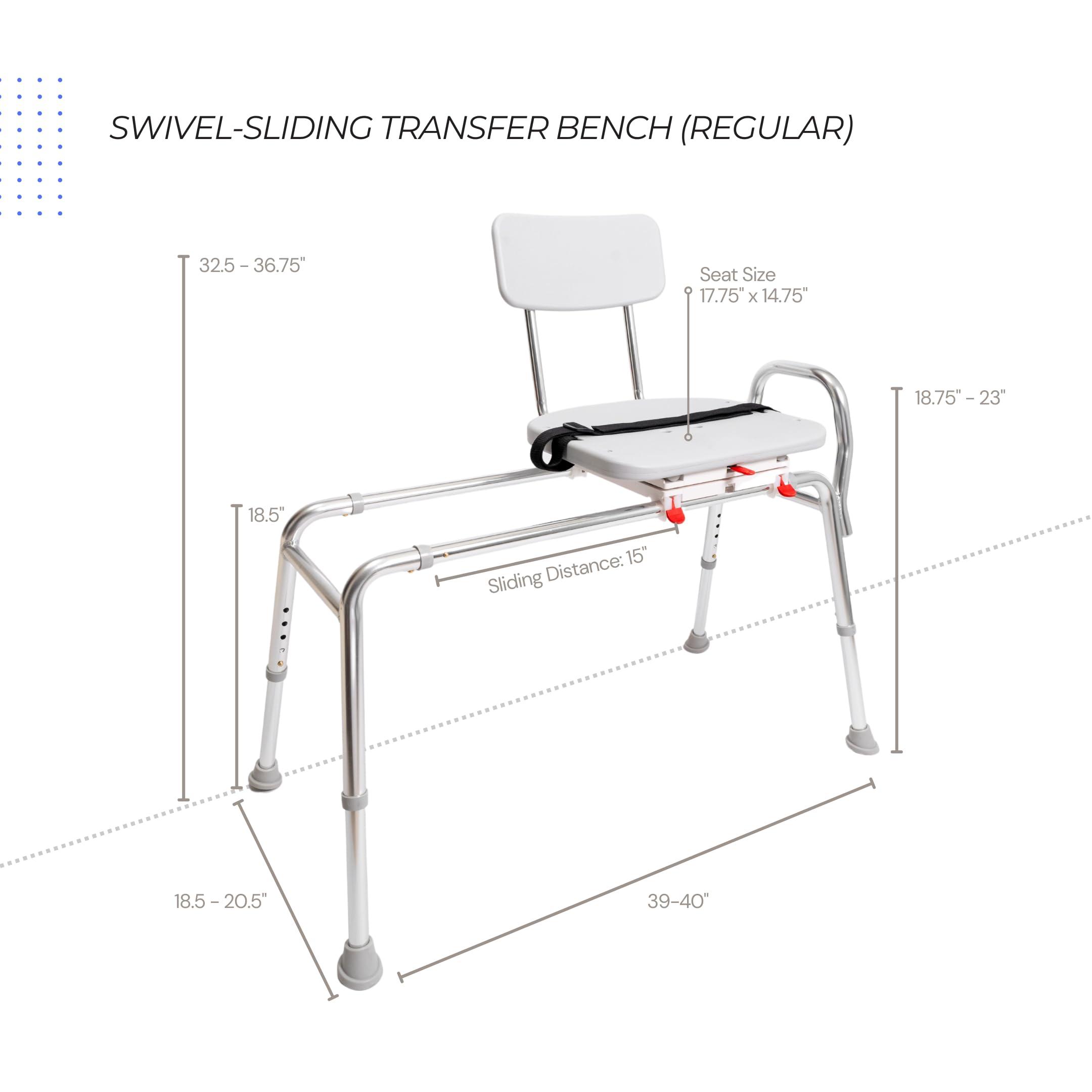 - SWIVEL SLIDING SHOWER BENCH & TUB CHAIR for elderly and disabled helps transfer in-and-out bath/tub smoothly and safely. No need to fear slipping and falling anymore! A Comfortable shower seat reduces the risk of skin tears and infections. Less aches and pains for caregivers.