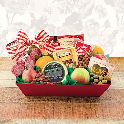 - Six deluxe pieces of fresh fruit, Yorkshire Wensleydale cranberry cheese, Yorkshire Wensleydale & apricots cheese, Tuscanini pitted olives, Divina fig spread, Almondina almond biscuits, Roasted almonds, Rectangular red tray