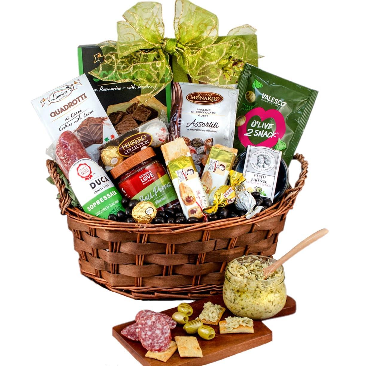 - Del Duca sliced sopressata, Valesco grilled, pitted green olives with garlic & herbs, Kitchen & Love roasted bell peppers, Cucina & Amore artichoke lemon pesto, Scrocchi rosemary crackers, Ferrero Rocher confections collection, Dolciara Monardo praline truffles, Matilde Vicenzi cream filled puff pastry, Matilde Vicenzi hazelnut filled puff pastry, Laurieri Quadrotti chocolate snack biscuits, Attimi pistachio cookies, Chocolate covered espresso beans, Two-toned oval basket