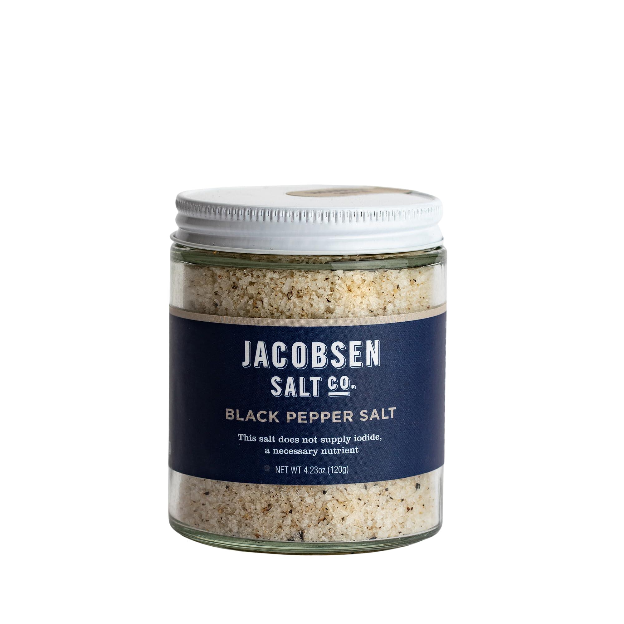 - A SUPERSTAR INFUSION Jacobsen Black Pepper Salt is infused with ground Tellicherry peppercorns, for a bright, briny take on a classic. Add an unexpected depth to your steak, quiche, or chicken