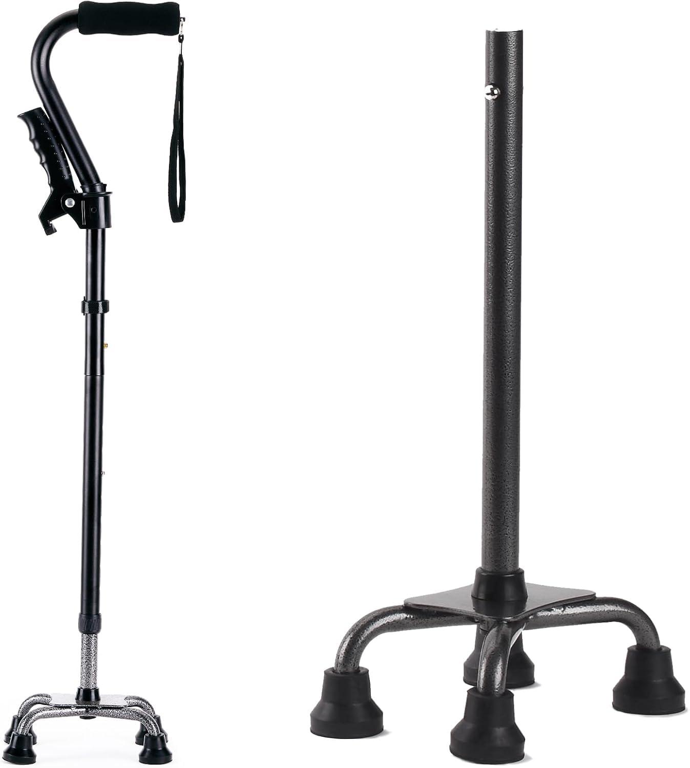 - Sturdy, heavy-duty four-wheel pole: Provides excellent stability and traction. Both are covered with non-slip rubber cane heads for extra stability and safety. The four-legged base makes it a self-standing walking stick that prevents falls or drops on the floor. Ideal for use after surgery when you are unable to bend or reach