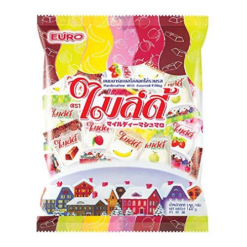 MILDY BRAND, Marshmallow is White ..... soft .... delicious, chewable, fun, filled with various styles of chocolate, strawberry, molon, lychee and banana, delicious, all taste, clean, quality produced from modern machinery. Ingredients : Sugar, Glucose Syrup, Palm Oil, Milk Powder, Gelatin, Cocoa Powder, Nature Identical Flavour, Artificial Colour INS102, INS133, INS127. Allergen Information: Contains Milk Powder and Maybe Contain Soy Lecithin.