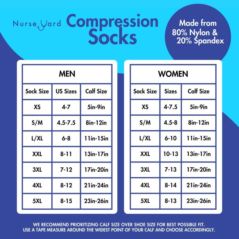 Nurse Yard compression socks are the ultimate solution for anyone spending long hours on their feet, especially nurses and medical professionals. Designed with 20-30 mmHg of graduated compression, these compression socks for women and men help improve blood flow, reduce swelling, and alleviate pain. From small to plus size compression socks, Nurse Yard has you covered. Standing or sitting for prolonged periods causes fluid to pool in your legs, causing leg pain, foot swelling, and neuropathic symptoms. Our compression socks' styles feature a unique design that starts with 30 mmHg of pressure at the ankle, gradually decreasing to 20 mmHg at the calf. This design supports blood flow back to the heart, reducing swelling and preventing conditions like Deep Vein Thrombosis (DVT). Nurse Yard socks are perfect for those seeking relief from venous disorders and other circulation issues. Nurse Yard compression socks are crafted to not slip, ensuring they stay in place during even the most active days. The wave stitching provides a breathable, comfortable fit, while the arch support helps relieve plantar fasciitis and arch pain. The zero-toe compression feature ensures your toes remain pressure-free, making these support socks for women and men the optimum choice for all-day wear. Our compression socks arent just for healthcare professionalstheyre versatile enough to be used as running socks by both men and women. Ideal for exercise, travel, pregnancy, or post-surgery recovery, compression socks help with lymphatic drainage, improve oxygenation, and prevent blood clots. Nurse Yard socks, designed in the USA, offer unmatched comfort and support, backed by a contentment promise. Whether youre buying for yourself or as a thoughtful gift idea for a healthcare hero, our compression socks help you stay pain-free and energized throughout the day. Experience the difference with Nurse Yard compression sockssupporting the hands that heal, one step at a time.