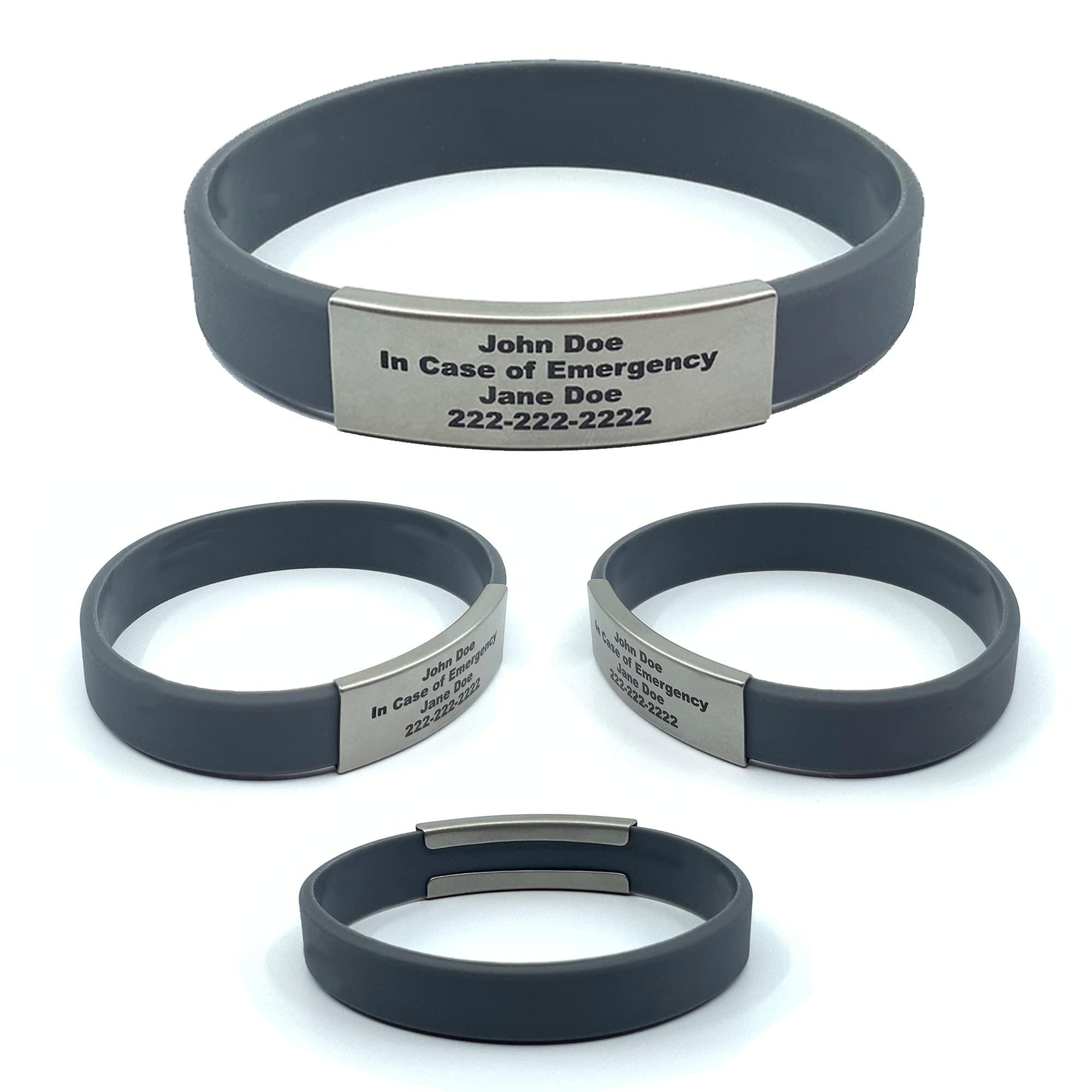 Personalize your daily wear with our Custom Silicone Bracelet, designed for style, comfort, and functionality. Each wristband features a durable, hypoallergenic silicone band paired with a sleek stainless steel plate, laser-engraved with up to four lines of your most important information. Whether youre adding a medical alert, motivational message, or custom text, the high-contrast black engraving ensures easy readability. Available in three sizesLarge (8 3/8""), Medium (7 3/8""), and Small (6 6/8"")these waterproof bracelets are stretchable and lightweight, offering a secure fit and all-day comfort without irritation. The slim, minimalist design complements any outfit, making it perfect for casual wear, fitness activities, or professional settings. Ideal for emergencies, these ID bracelets provide quick access to crucial information for family, friends, or first responders. Durable and designed for daily use, theyre built to withstand the rigors of your lifestyle while keeping your personalized message intact. Upgrade your wristwear with a customizable bracelet thats both practical and stylish, making it a thoughtful gift or a functional accessory for yourself.