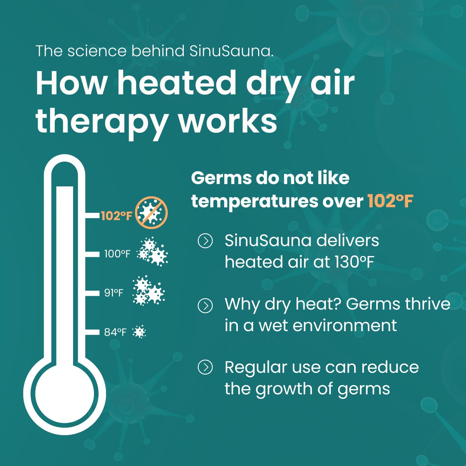 - HOW IT WORKS: SinuSauna uses heated dry air therapy. Germs dont like temperatures over 102F and SinuSauna delivers 130F heat. Germs also thrive in wet environments and the dry heat limits their growth. Regular use can reduce the growth and buildup of germs.