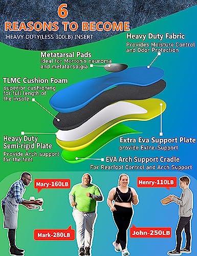 • HEAVY DUTY SUPPORT INSOLES Men and women's arch support insoles that can withstand up to 300 pounds of weight, providing all-day support and shock absorption to alleviate leg and foot fatigue. The U-shaped heel design increases stability, reducing the risk of ankle sprains and other injuries caused by unstable footwear.