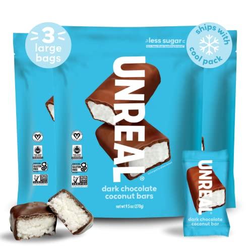 - UNREAL's DELICIOUS DARK CHOCOLATE COCONUT BARS come in 3 value size bags with 18 individually wrapped servings per bag.