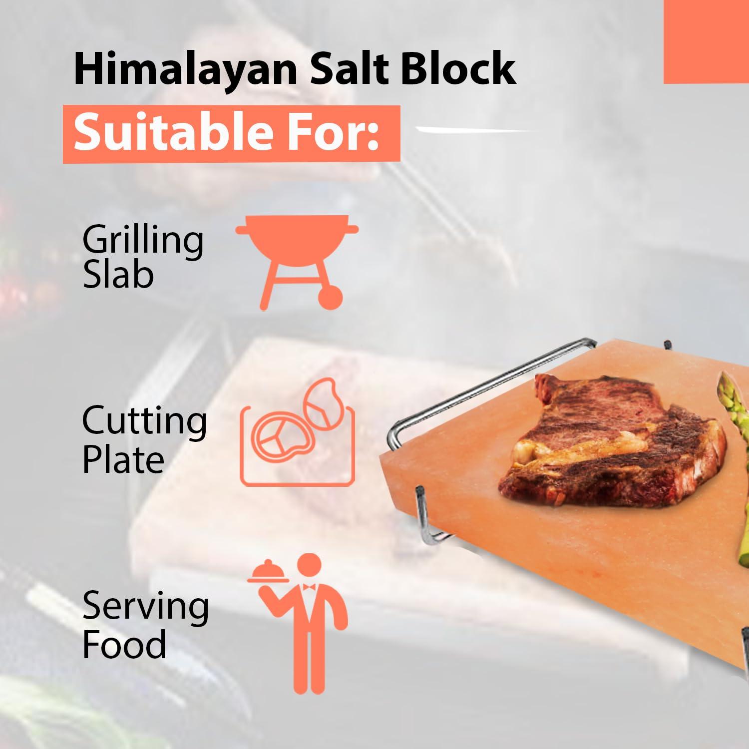 - Comprehensive Package: Includes 100% Natural Himalayan Salt Cooking Block and Stainless Steel Tray Holder. Salt Block size: 12x8x1.5 inches and it's Food Grade.
